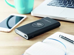 Power bank wireless da 8000mAh in ABS con finitura gommata.